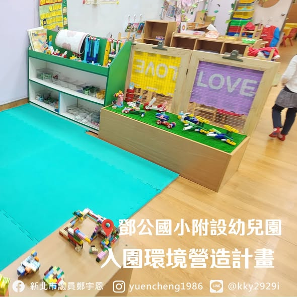 宇恩在鄧公國小附設幼兒園裡,發現家長們趁著空檔幫學校設計了一個可愛的布告欄,教室裡有孩子專屬的說故事小屋、有新奇的竹節蟲觀察箱,滿滿的老師和家長們的用心。聽到幼兒園主任希望可以 #重新營造入園環境,除了在視覺上增添溫度和趣味,也增加實用性,#結合鞋櫃和安全帽放置牆等等,宇恩立刻舉雙手贊成,也答應會全力幫學校來爭取預算。