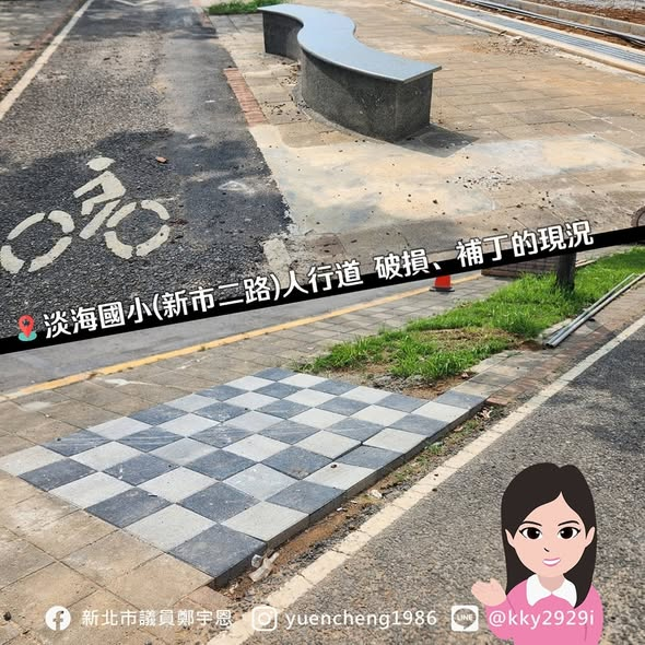 再兩周就要開學了,先不說淡海國小校舍還在趕工,就連校門口前的人行道,受到工程影響壓毀破損、軟底遭侵蝕,還有移植的樹穴等等的,卻未被納入改善。一旦迎來開學,淡海國小的校門口人行道將充滿補丁,若下雨將出現沉陷,嚴重影響學童通行安全!