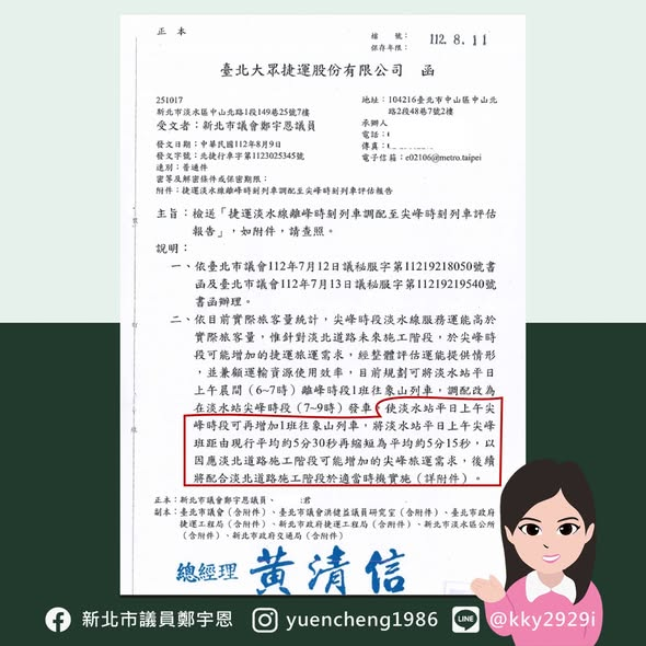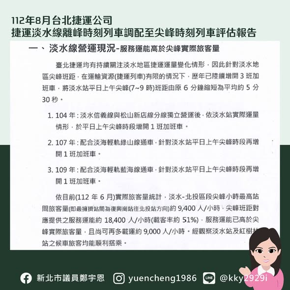 宇恩會持續關注淡水站的班距的問題,也會持續要求相關單位展開 #淡北直達車 的評估,也希望市府和北捷共同為推動淡水更便捷的大眾運輸來努力!