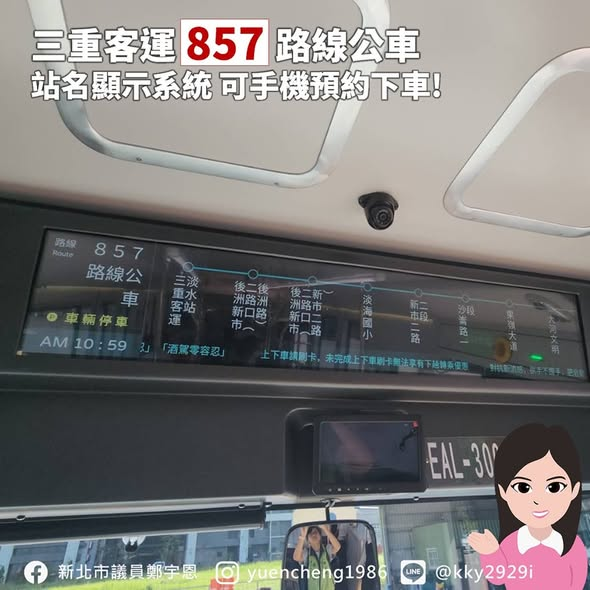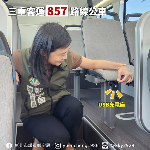聽已經搭過857的鄉親分享,車上空間相當舒適、到站看板也和輕軌一樣清楚明瞭,今天宇恩實地到三重客運場站考察,發現座位不僅舒適,椅墊下方還有USB充電孔,很適合長程通勤乘客使用;站名顯示系統,還可以搭配台北公車通APP #預約下車,到站前手機會提醒您準備下車、同時亮起下車鈴指示司機到站停靠,真的很方便。