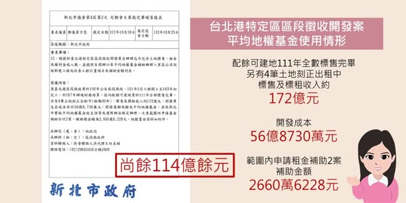 根據宇恩向地政局調閱的資料,截至2023年10月,台北港特定區土地標售及標租收入有172億元,扣除掉開發成本和範圍內的補助案,還有114億餘元,可以用來推動八里地區各項基礎建設。
