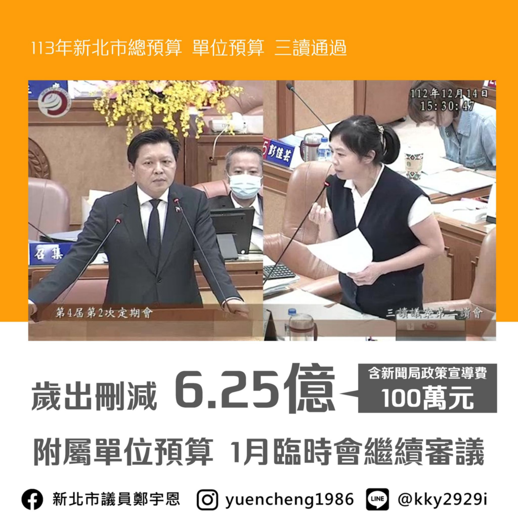 儘管在國民黨人數優勢強力護航下,宇恩和民進黨團仍全力監督市府要求樽節開支。經三黨協商決議 #統刪6億2400萬,另刪減新聞局運用各式媒體辦理本市政策宣導相關經費100萬元,刪減後歲出2124.85億元,相較去年仍增加7.4%。