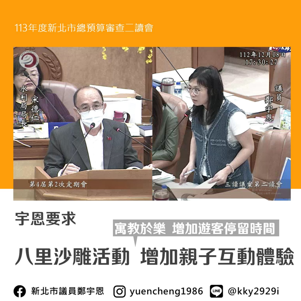 八里一年一度的沙雕活動,宇恩建議水利局,除了原有的專業主題沙雕,加入寓教於樂的親子互動體驗區,讓沙雕活動更豐富,也讓遊客有機會可以駐足八里更久、給我們地方帶來更多經濟效益!