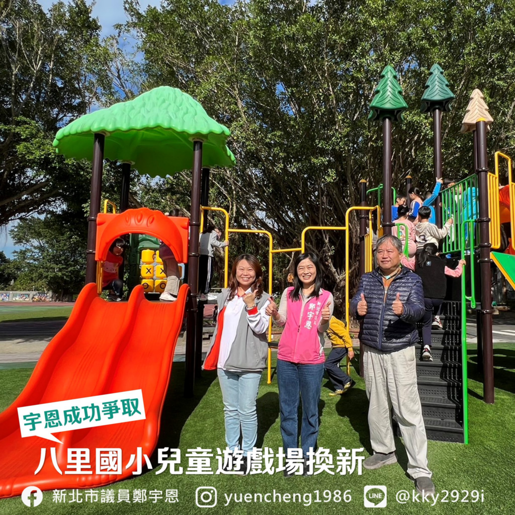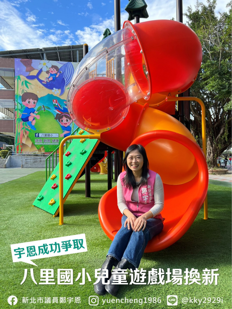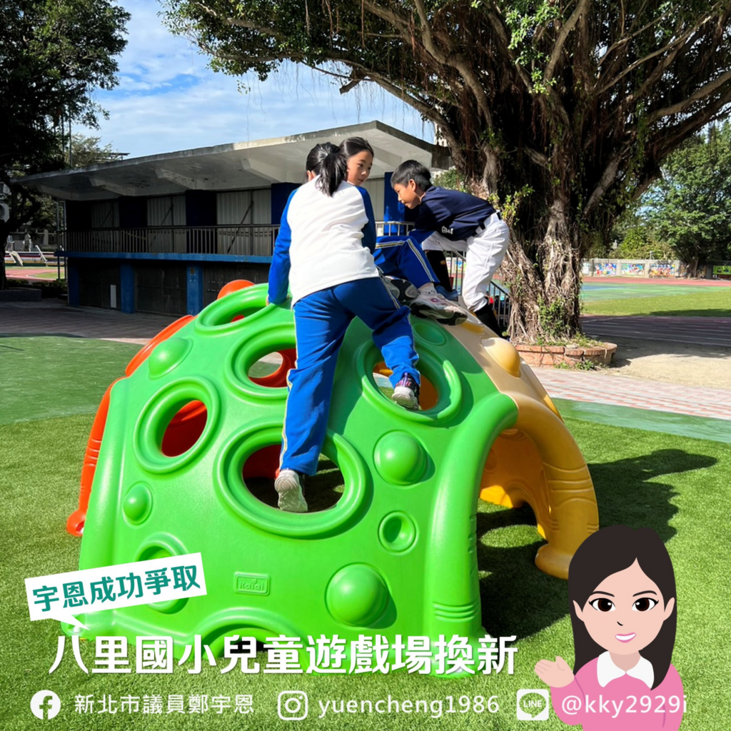 還記得去年來到八里國小,遊戲場的溜滑梯破了個洞,樓梯、平台鏽蝕斑斑,彈性地墊也早已失去色澤和彈性。