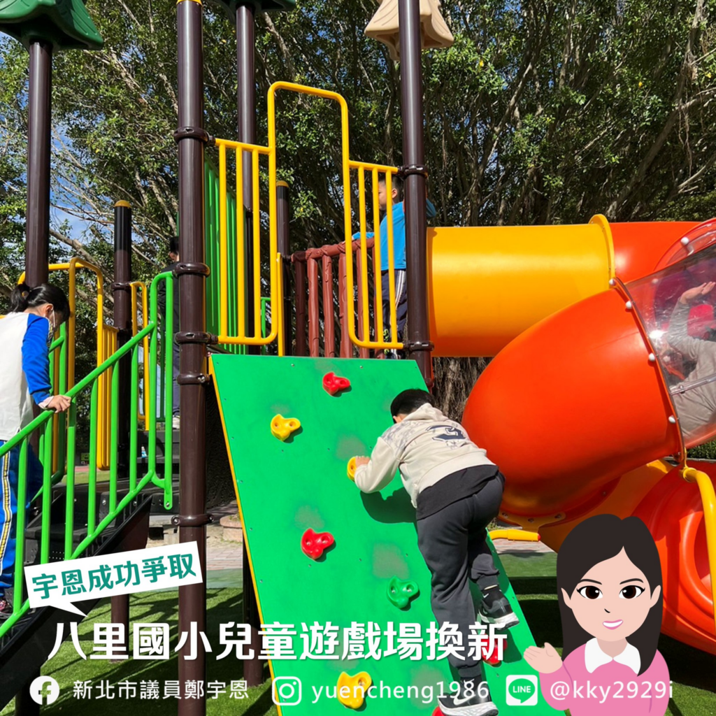 不過現在來到八里國小,煥然一新的遊戲場一到下課時間就是大排長龍,有好玩的溜滑梯、具挑戰性的攀岩牆、還有舒適安全的人工草皮!