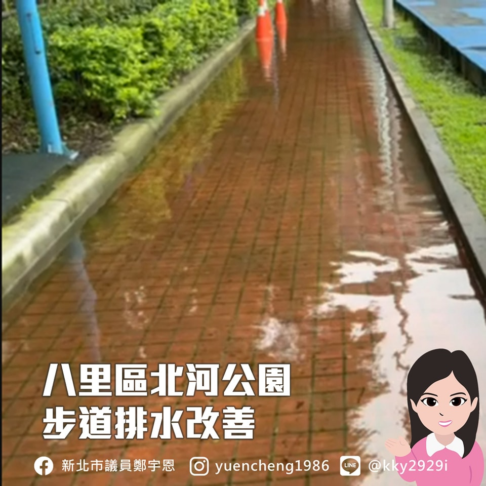 日前收到民眾反映,自從蓋了天幕球場,北河公園內的步道就會出現積水久久難以消退。宇恩便邀集八里區公所和 #林秀真里長 一起會勘討論改善方式。