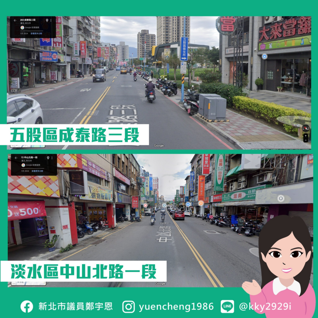 不過我們看到在 #五股區的成泰路三段,同樣是雙線各一線道,但在單側設置了 #實體人行道、 #設施帶 以及機車停車格。這樣的設計或許有機會解決淡水中山路的問題!