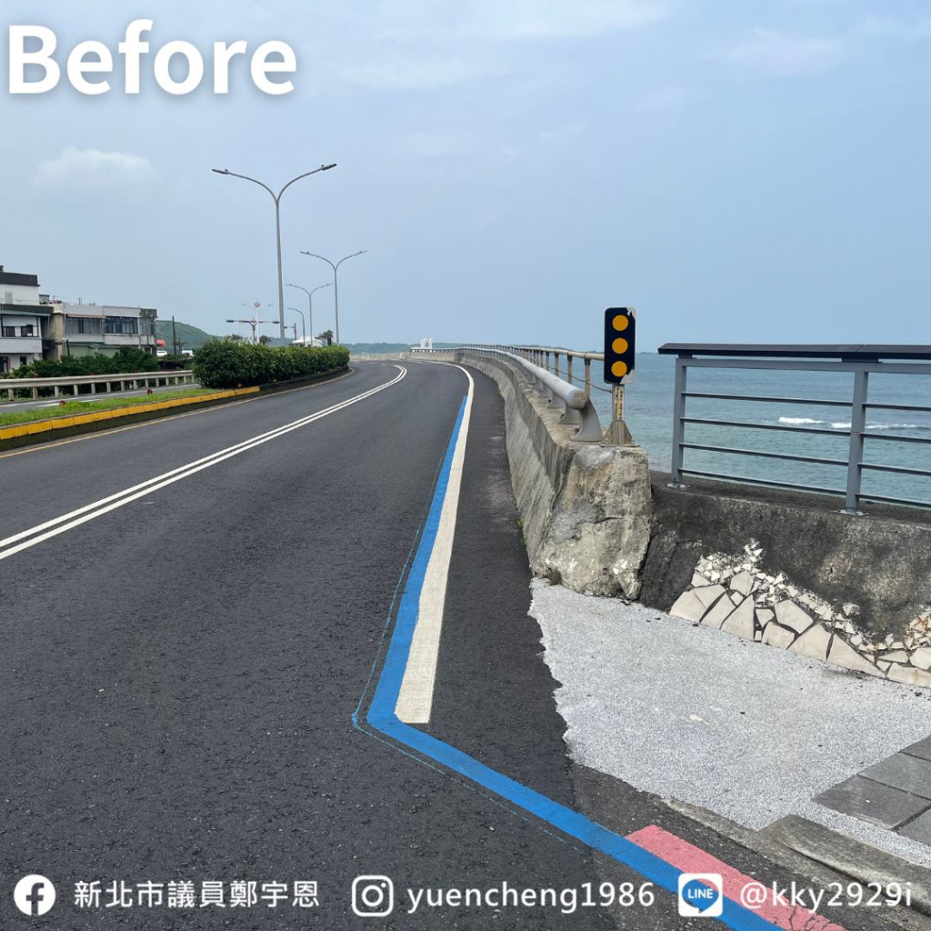 石門區婚紗廣場旁 #畫設人行道 & #增設反光防撞桿 改善完工,婚紗廣場旁人行道做為通往富基漁港的主要行道,改善前無人行道,夜晚昏暗時也難以注意到行人,在改善後解決了當務之急,但根本上的問題還是需要有實體人行道