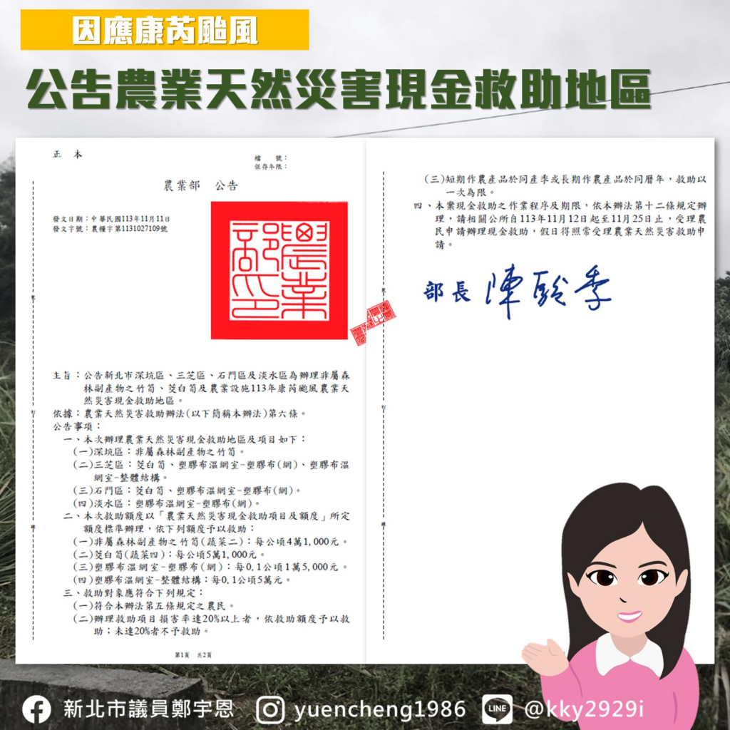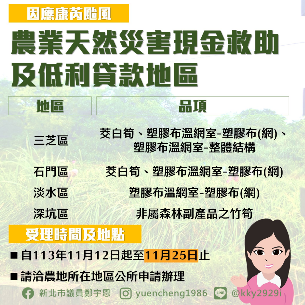 農業部於113年11月11日公告新北市深坑區、#三芝區、#石門區 及 #淡水區 為辦理非屬森林副產物之竹筍、#茭白筍 及 #農業設施 113年康芮颱風農業天然災害現金救助地區。