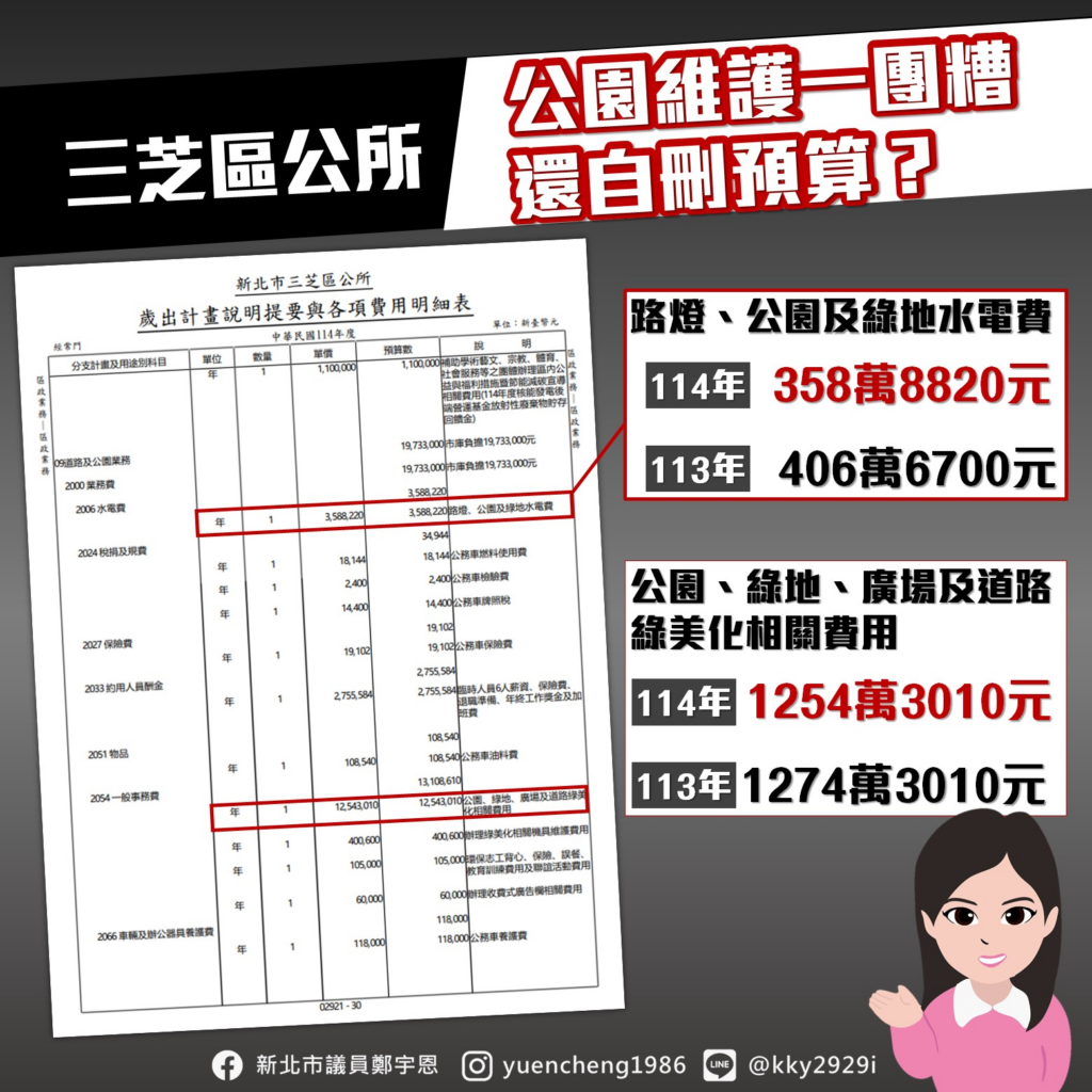 根據三芝區公所114年預算書,涉及公園綠地綠美化費用共2筆,其中一筆「路燈、公園及綠地水電費」編列358萬餘元,相較113年 #減列48萬元;另一筆「公園、綠地、廣場及道路綠美化相關費用」編列1254萬餘元,相較113年 #減列20萬元,整體可用於公園的費用,減少了4%。