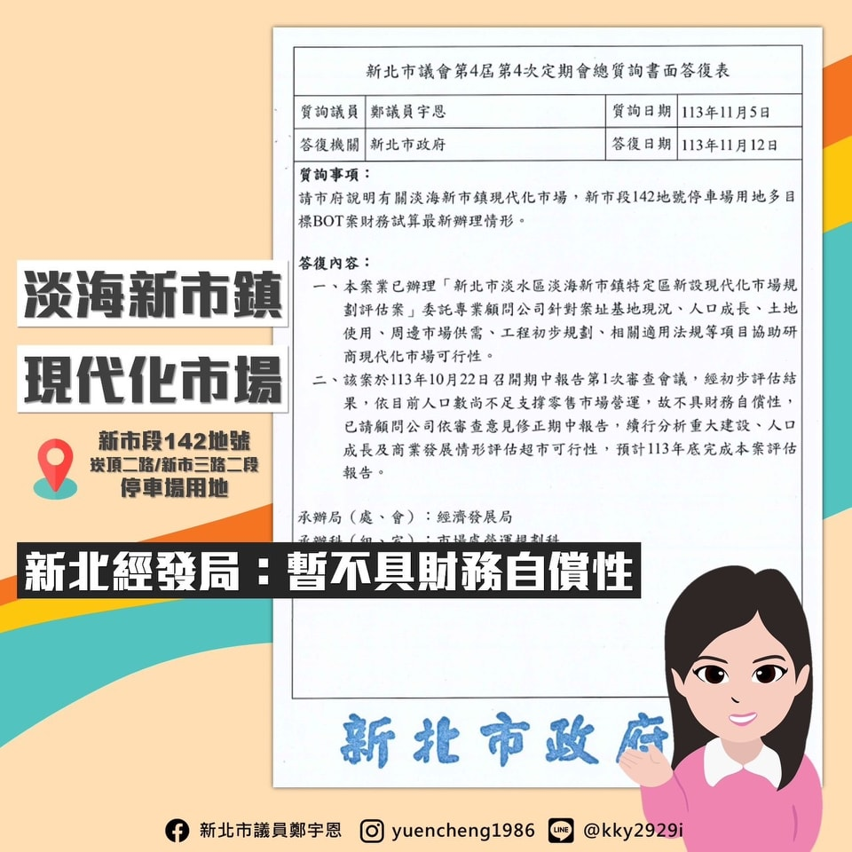 宇恩不斷在議會爭取在淡海新市鎮興建一座公有市場,以照顧淡水地區居民的民生採買需求。去年初,市場處提出了 #淡海新市鎮特定區新設現代化市場規劃評估案,但歷經去年一整年的評估,年底市府回覆認為 #暫不具財務自償性