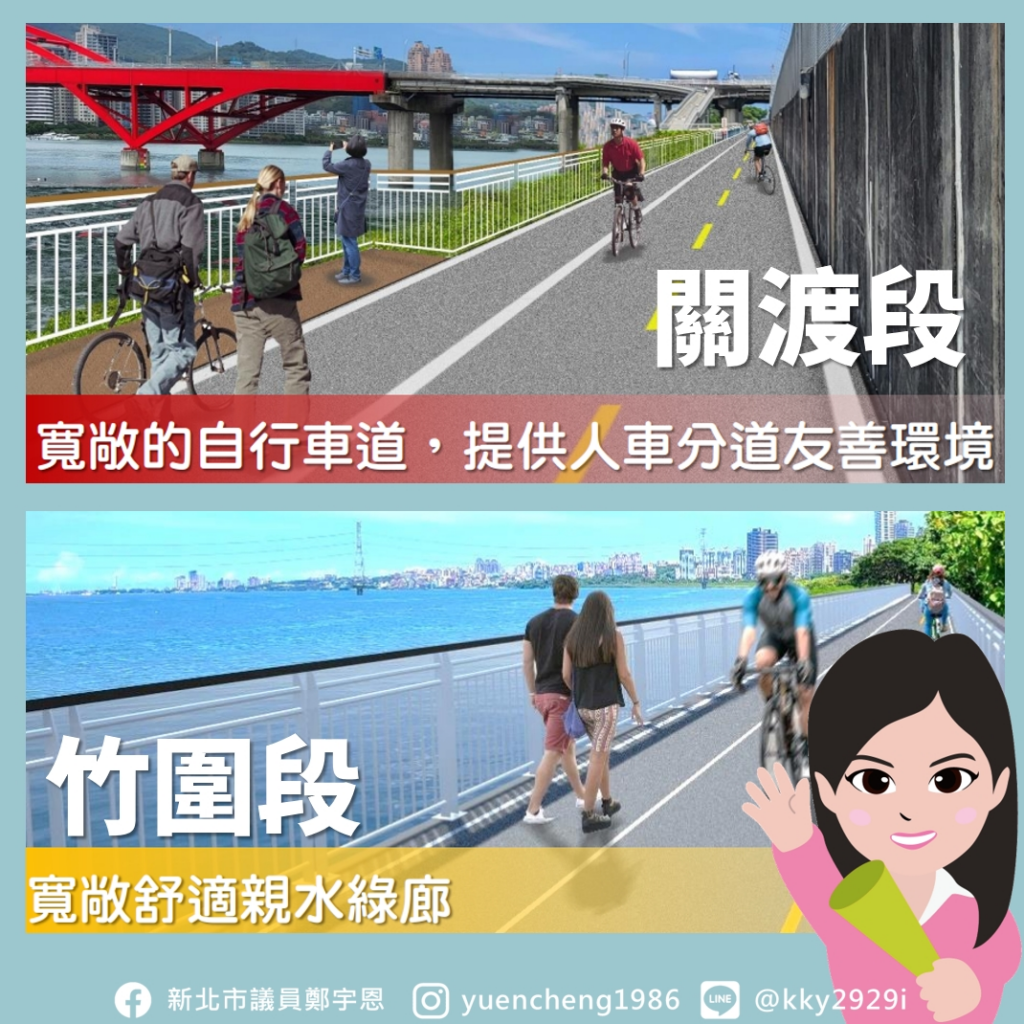 全線完工後將透過淡江大橋與八里自行車道連結,成為環狀自行車道,不僅提居民休憩的好去處,未來結合北海岸自行車道,期盼一舉躍昇成國際景點