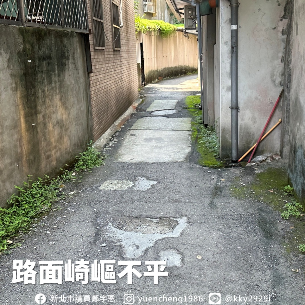 淡水區水源街一段農會超市旁有一條居民生活的小徑,路面已崎嶇不平,遇雨坑洞積水,對於長輩、小朋友通行十分危險。