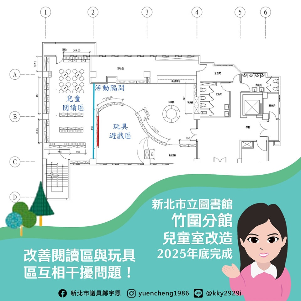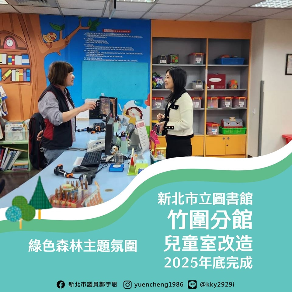 位於民生活動中心4至6樓的竹圍分館,其中4樓的兒童室自2009年設立以來都沒有整修過,宇恩多次會勘並爭取到中央補助84萬餘元、市府自籌104萬餘元的經費,要來改造兒童室啦!