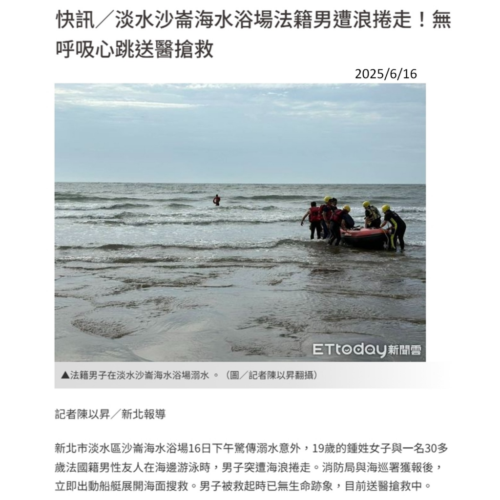 今天下午,沙崙海水浴場驚傳泳客遭海浪捲走,經海巡救起後已無呼吸心跳,令人心痛。這再次暴露過去政府在水域管理上「只禁不管」,所產生的管理空窗。