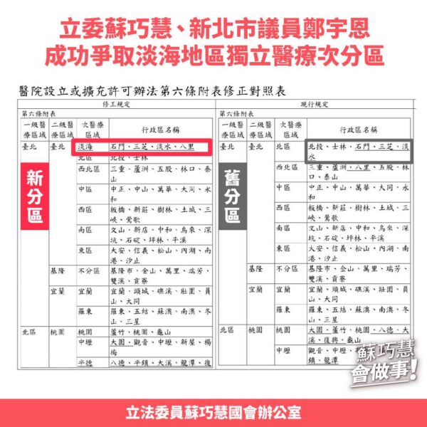 淡海地區需要醫院,不久前也中央也已經完成法規鬆綁,宇恩持續在議會來追蹤。包含這次的市政總質詢,宇恩也再次向市府來確認,得知「國土署確實有納入規劃,新北仍持續與中央溝通座落地點。」