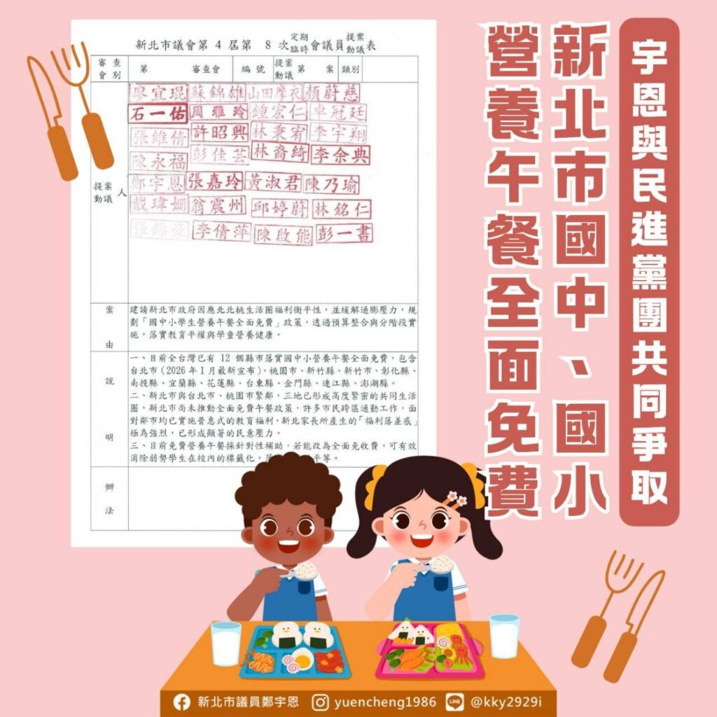因此,宇恩和民進黨團夥伴已在議會正式提案,讓新北市國中小孩子,也能享有一樣的照顧。