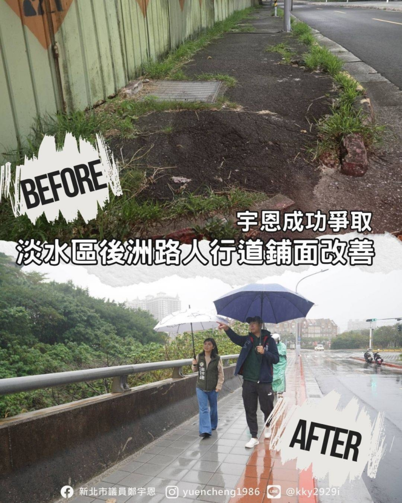 這段工程更新長度約 440公尺,過去人行道鋪面是老舊的柏油材質,凹凸不平,積水泥濘、雜草叢生,推嬰兒車、牽小朋友、長輩散步都很不方便;宇恩和吳庭岳里長一起努力,這次終於把人行道鋪面全面換新,走起來更平整,也讓整體街景更清爽。