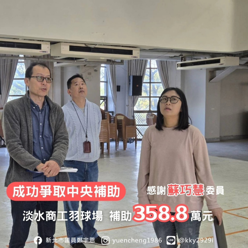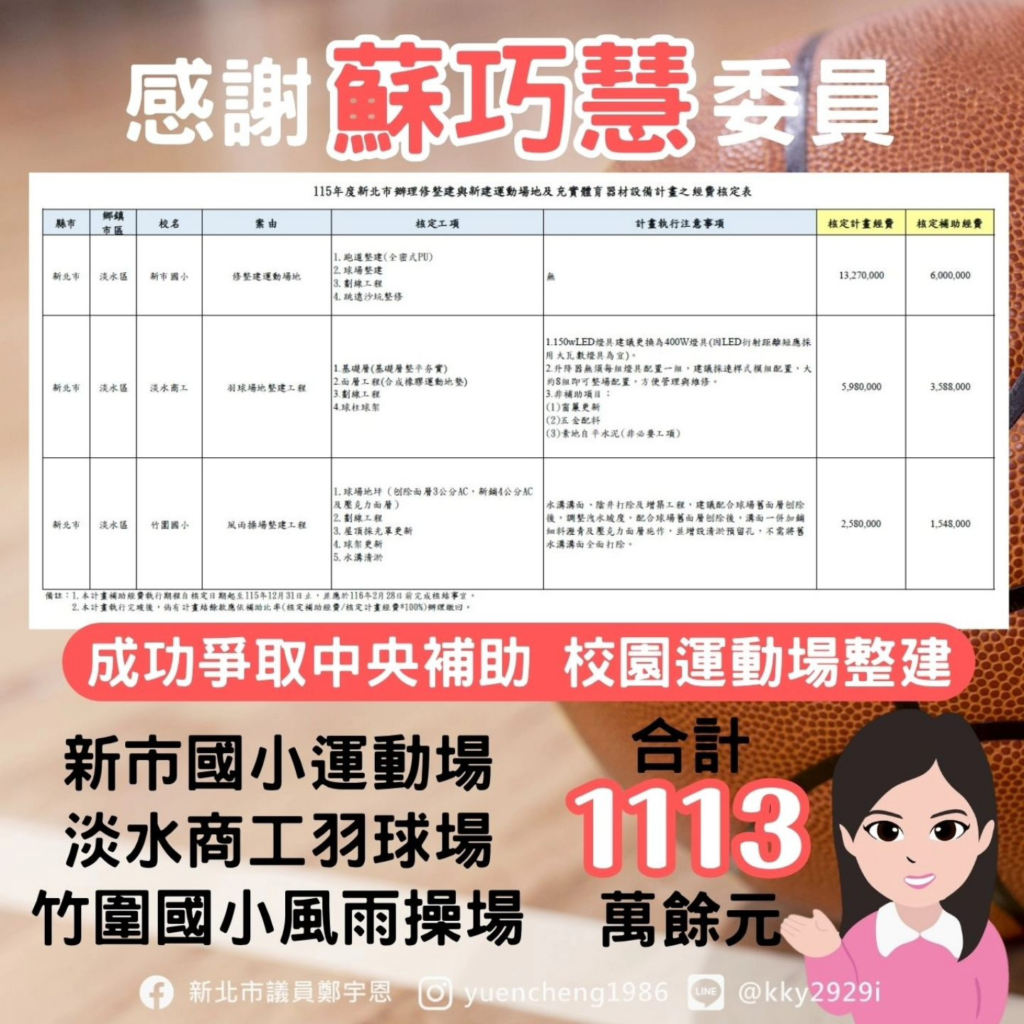 蘇巧慧委員從去年陪著宇恩走訪學校實地勘查,並持續協助追蹤,在今天收到在淡水總共3所學校獲得補助,實在太開心了!期待學校即刻展開行政作業、利用暑假施工,讓孩子們新學期就有煥然一新的運動場地!