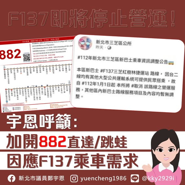 F137即將停駛!宇恩呼籲:加開882直達/跳蛙 因應F137乘車需求三芝交通2022 年 12 月 30 日2022/12/30 過去幾年新北市政府推動新北市新巴士轉型,試圖將政府資源做最有效利用,也就是將與社區公車路…查看新聞